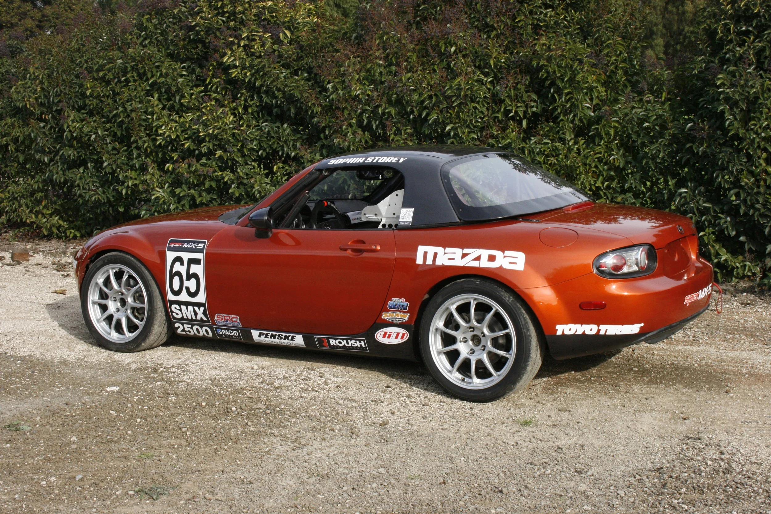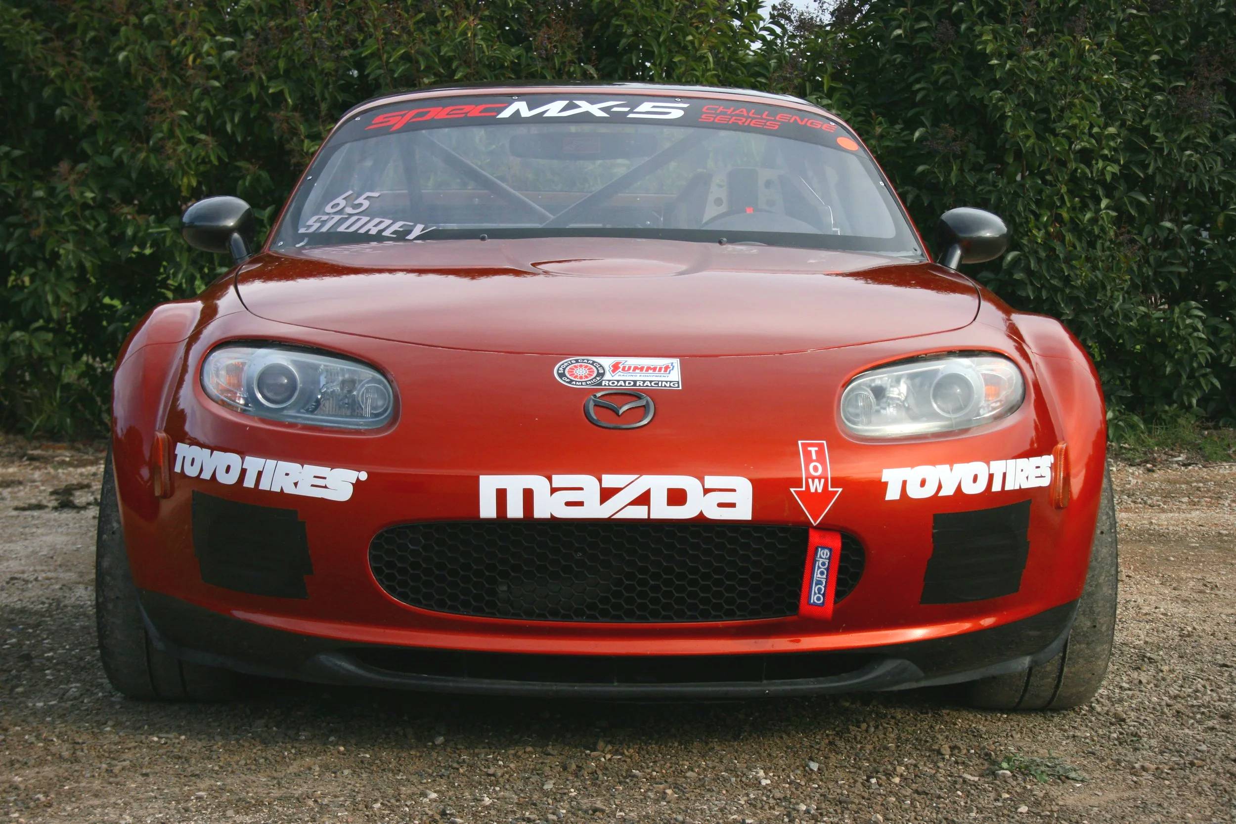 The Spec MX-5 is equipped with a full roll cage, a fire supression system, a 6 point harness, and a full containment seat.